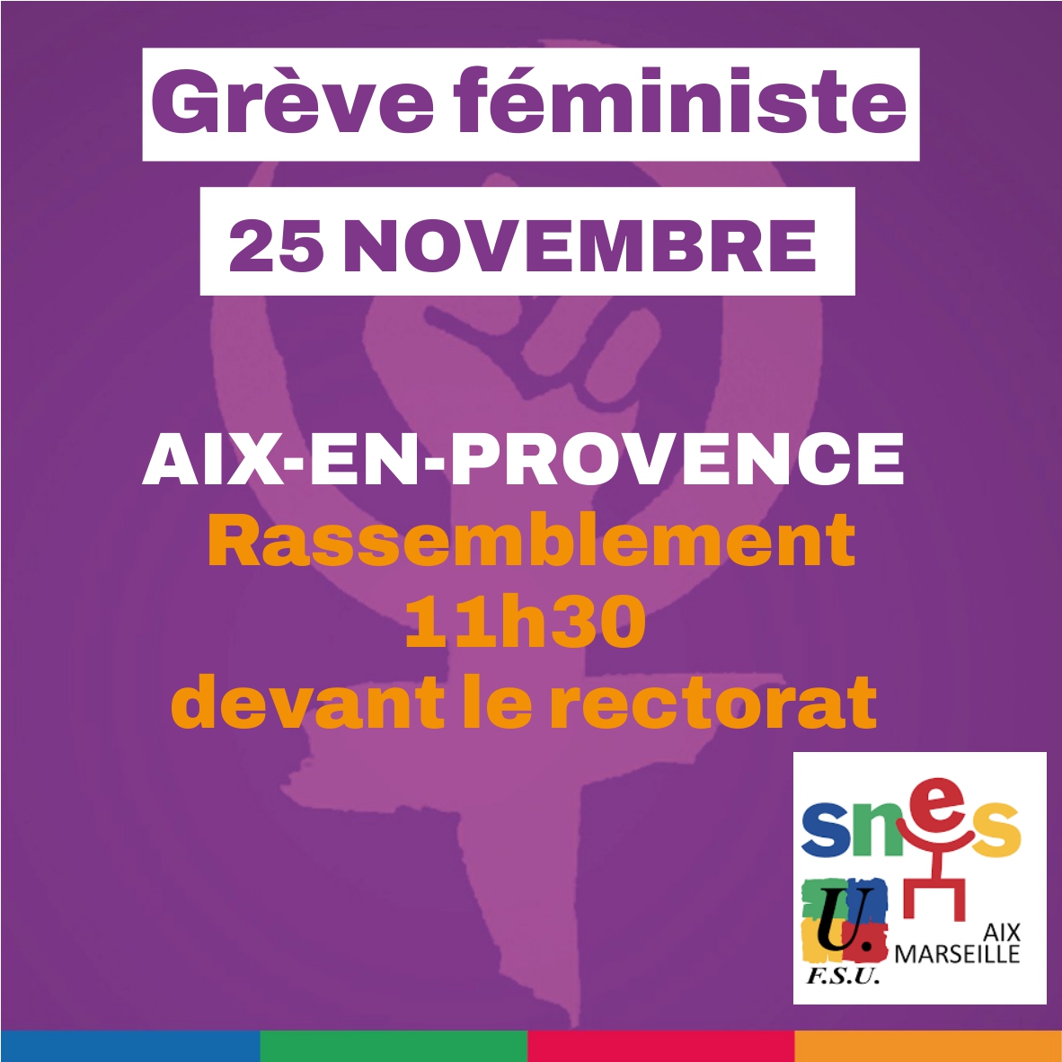 Cette année le 25 novembre, Journée internationale de lutte contre les violences faites aux femmes, est aussi le jour du CSA académique. Le SNES-FSU Aix-Marseille se saisit de cette opportunité pour dénoncer le mépris avec lequel sont traitées les victimes et appelle à la grève et à la mobilisation. Il propose un rassemblement devant le rectorat ainsi qu’une conférence de presse pour dénoncer le silence, l’inaction et le mépris. Nous exigeons une véritable politique de prévention, de protection et de sanction des violences sexistes et sexuelles dans notre académie et au-delà dans notre ministère.