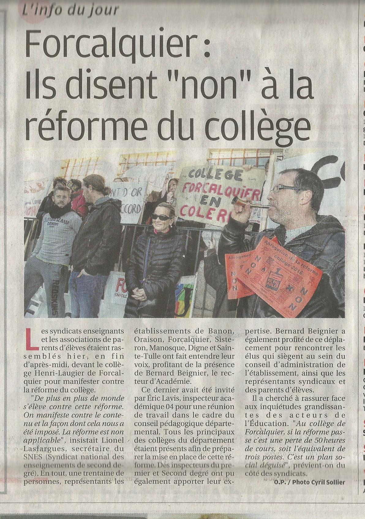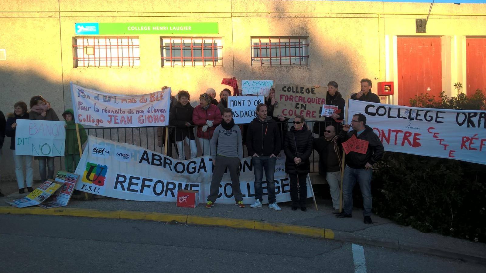 Environ une quarantaine de collègues venus de Banon, Sisteron, Oraison, Mont d’or, Giono, St Tulle etc... étaient devant les grilles du collège de Forcalquier pour faire du bruit et montrer leur opposition à la réforme des collèges.