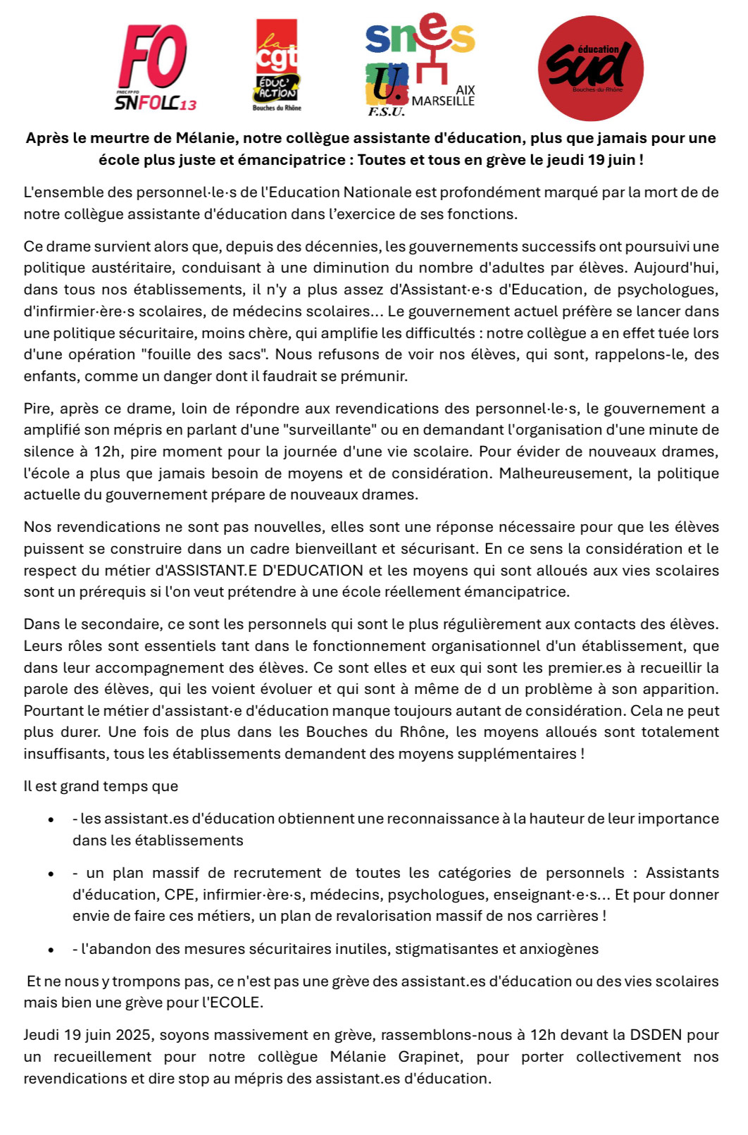 L’assassinat brutal de notre collègue Mélanie Grapinet assistante d’éducation (AED) à Nogent-sur-Marne, survenu le 10 juin 2025, a choqué l’ensemble de la communauté éducative. Toutes nos pensées vont vers ses proches, ses collègues et ses élèves. Un rassemblement a eu lieu en son hommage à Marseille, l’émotion de perdre une collègue dans ces conditions est vive et douloureuse.