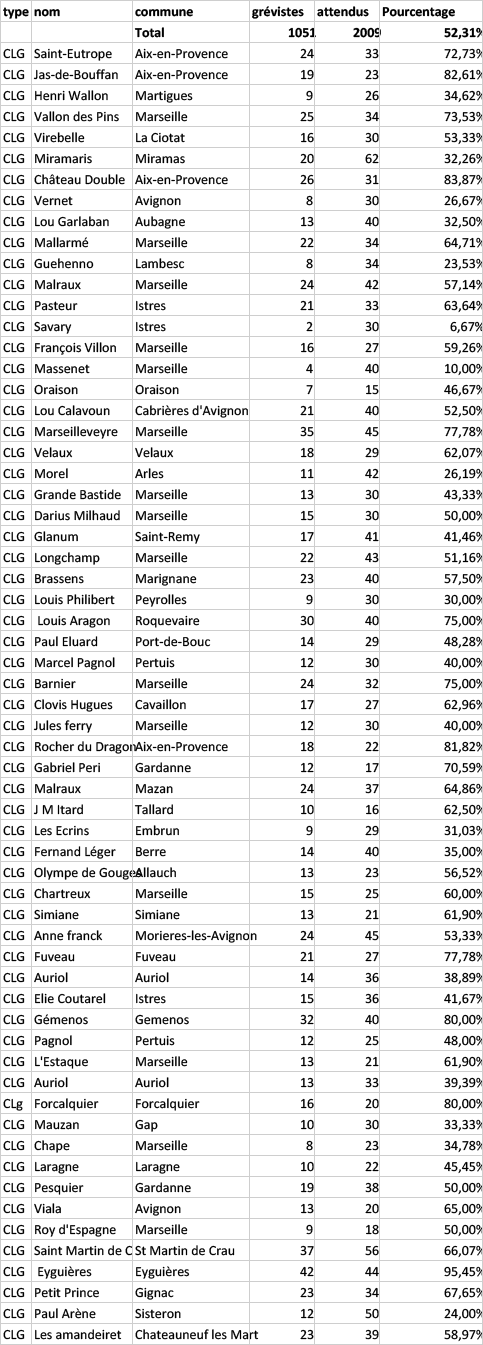 Le SNES-FSU Aix-Marseille publie les données issues d’un panel de quarante collèges (voir ci-dessous) de l’académie, portant sur près de 1500 professeurs attendus en service avant 10 h ce matin, faisant apparaître un taux de grévistes supérieur à 50 %.