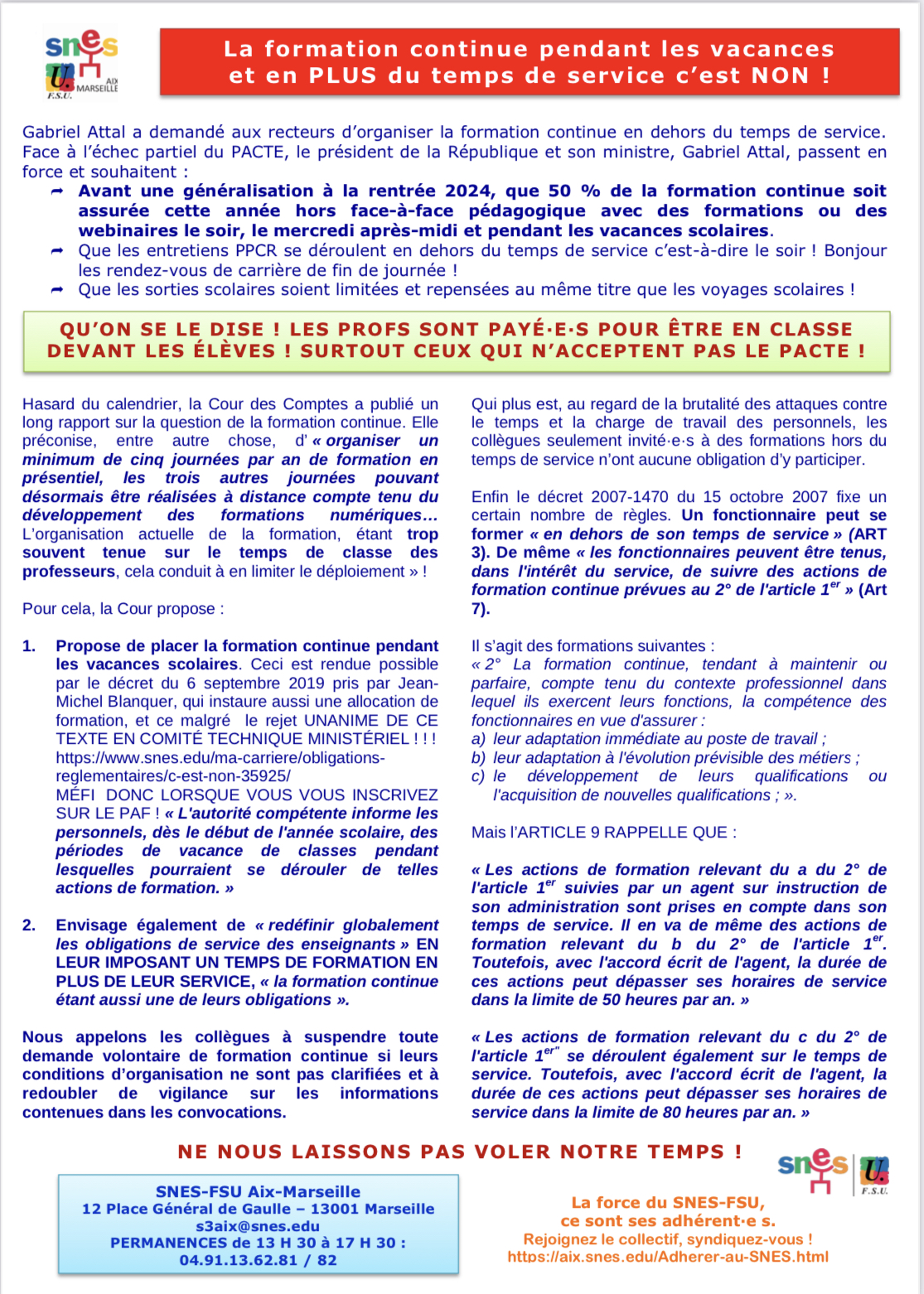 Vous êtes ici : Accueil Actualités La formation continue pendant les vacances et en plus du temps de service c’est NON 27 septembre 2023 Actualités La formation continue pendant les vacances et en plus du temps de service c’est NON Imprimer l'article Le tract La pétition formation continue