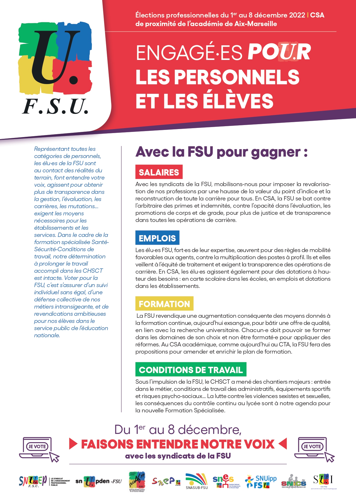 Du 1er au 8 décembre vous pourrez voter pour ces listes FSU soutenues par le SNES dans les instances qui vous concernent.