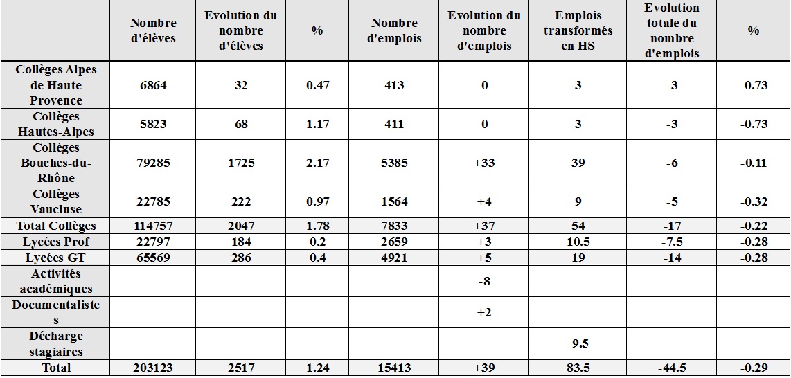 Ce contexte démographique supposerait que l’académie se voie dotée de 191 emplois d’enseignants supplémentaires pour maintenir les taux d’encadrement actuels. Selon la présentation du ministère, seulement 39 emplois supplémentaires sont attribués à l’académie d’Aix-Marseille au lieu des 191 attendus.